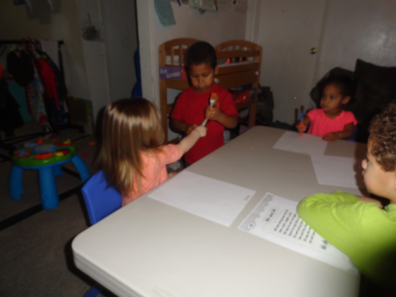 | Now, they are creating their own Johnny Appleseed puppet. The children are decorating their puppets with the clothing pieces and pot hat's that came in our kit. |